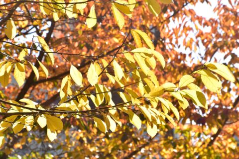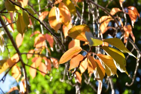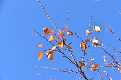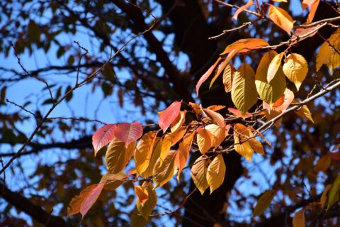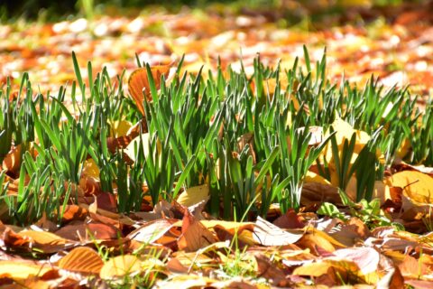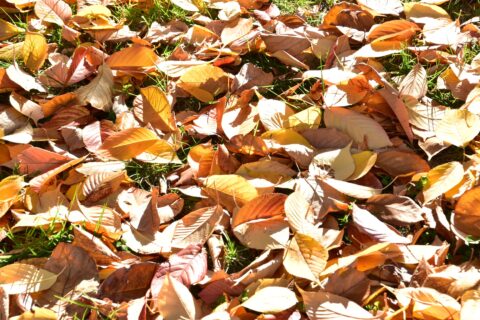 | もう芽が出てきている水仙の葉に落ち葉がブレンドされていたり、 桜の木の下は赤っぽい絨毯になってたり。 今の季節ならではの風景が広がっていますね。 身近の秋。 |